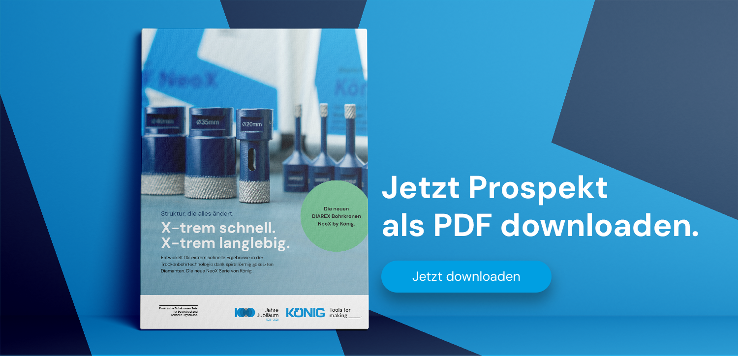 Wer NeoX nutzt, spart Zeit, schützt Material und erreicht perfekte Ergebnisse in einem Zug. Die König F NeoX Bohrkronen liefern saubere Ergebnisse – schnell, zuverlässig, unkompliziert. Mit Durchmessern von 5 bis 130 mm sind sie die erste Wahl für Fliesenleger, Natursteinprofis und GaLaBauer, die nicht lange bohren, sondern schnell und effizient fertig sein wollen..
