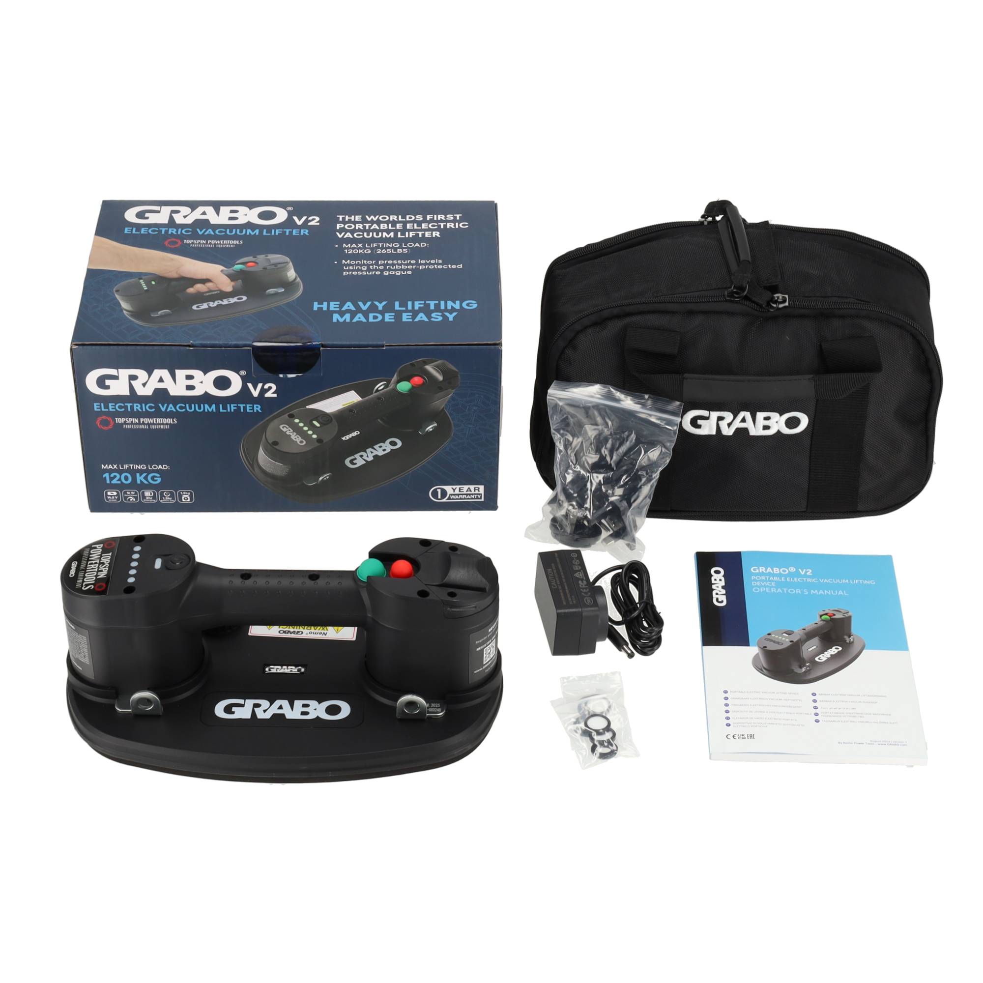 Lieferumfang: 1x Akku-Vakuumsaugheber Nemo Grabo PLUS V2, 1x Akku 14,8V Li-Ion 2.2 Ah, 1x Akkuladegerät, 1x Gummi-Schaumdichtung, 1x Ersatzfilter-Set und 1x Tragetasche