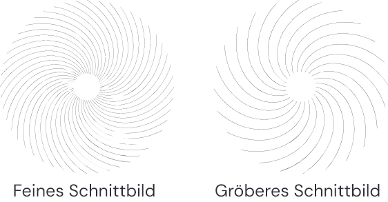 Je niedriger die Zahl, desto schneller der Schnitt. Der Materialabtrag ist höher, das Schnittbild entsprechend gröber. So entscheiden Sie nicht zwischen gut oder schlecht, sondern bewusst zwischen Geschwindigkeit und Schnittqualität. Abgestimmt auf Material, Anwendung und Ihrem gewünschten Ergebnis.