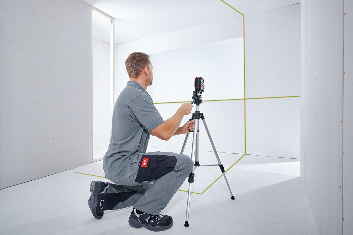 - mit einer horizontalen und zwei vertikalen Laserlinien im 90° Winkel plus Lot (rote Laserlinie), einzeln schaltbar