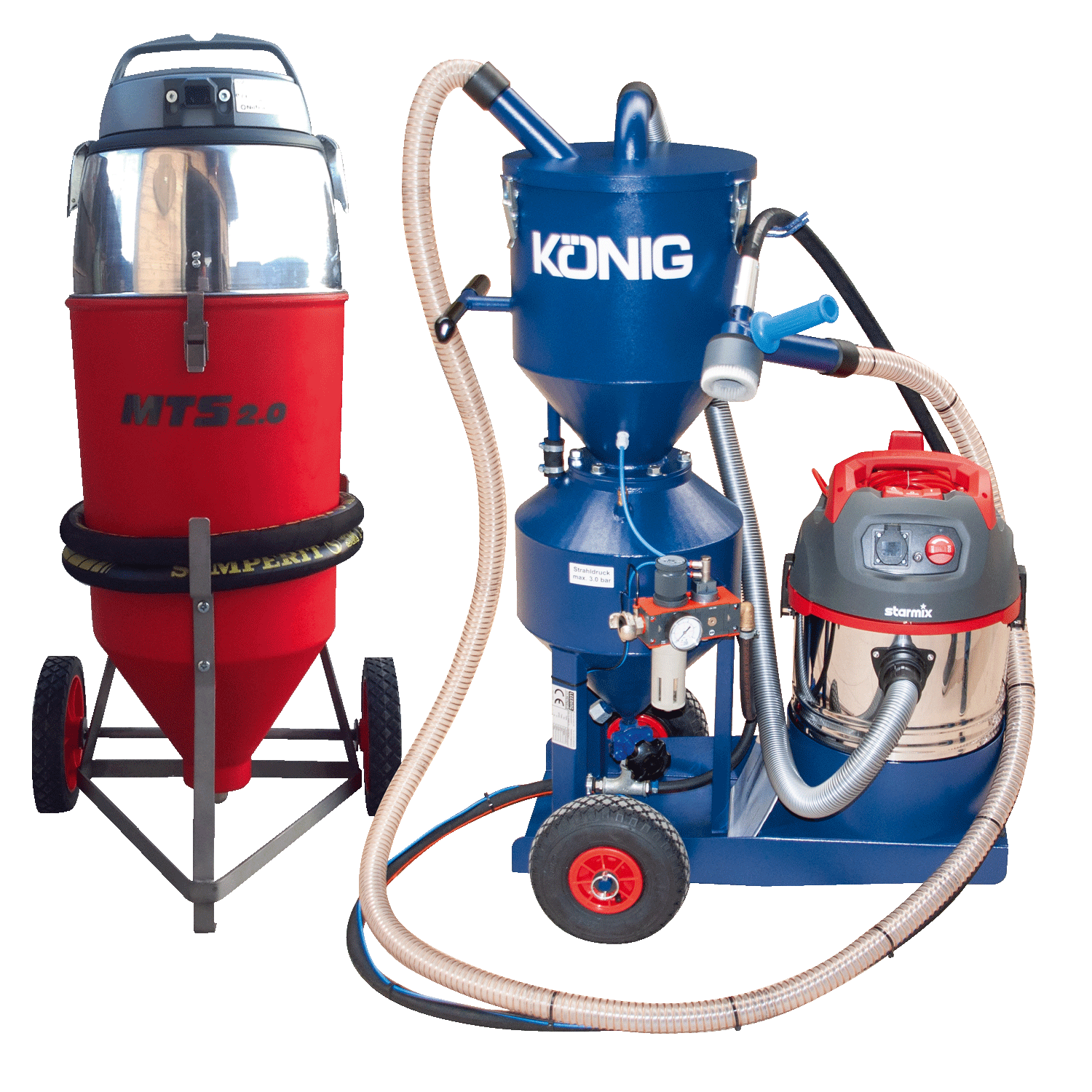 - Vollautomatischer Strahlmittelkreislauf, erzeugt durch leistungsstarke Vakuumpumpe mit vorgeschaltetem Zyklonabscheider zur Trennung von Grob- und Feinstaubpartikeln.