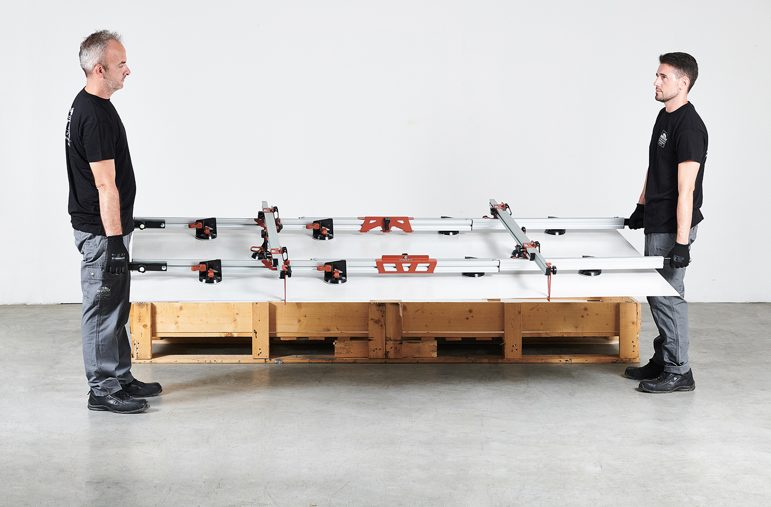 - ermöglicht das Handling von einer Fliese, mit einer Größe von bis zu 150 x 150 cm, von einer einzelnen Person