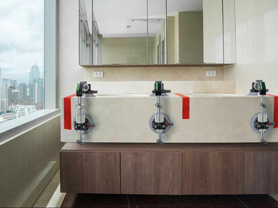 - durch drehbare Vakuumsauger auch zum Versetzen von Innenecken an Duschrückwänden geeignet