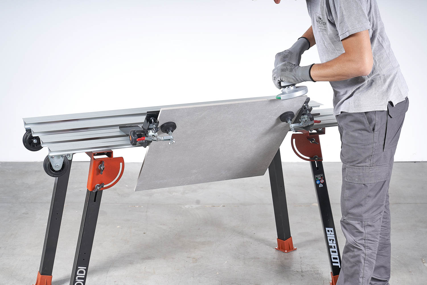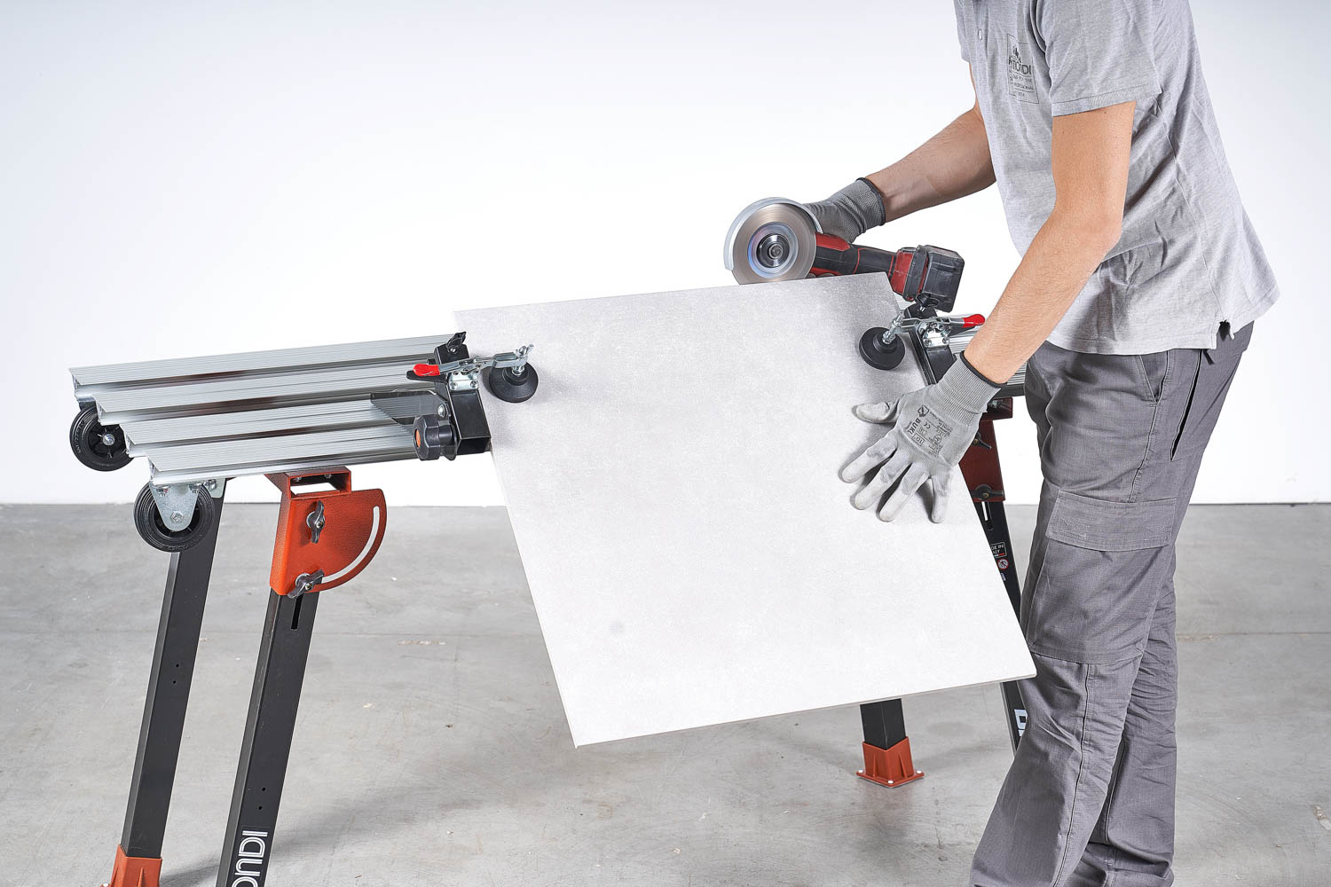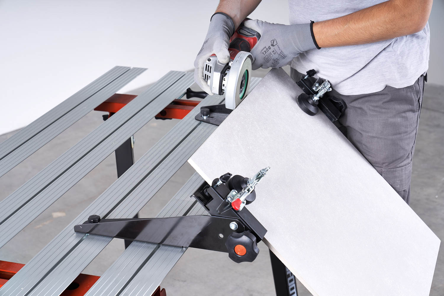 - Variable Klemmvorrichtung mit verstellbarem Neigungswinkel zur optimalen Bearbeitung der Kanten von Fliesen und Sockelleisten