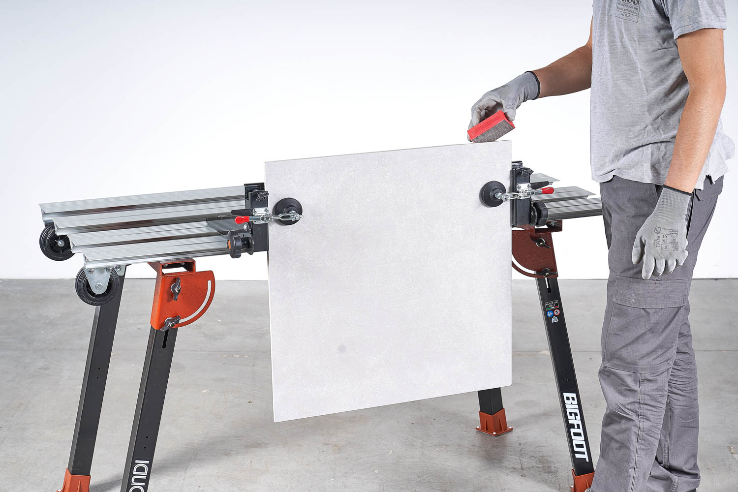 - Spannbacken sind mit Gummischutz ausgestattet, um Beschädigungen an den Fliesen zu vermeiden